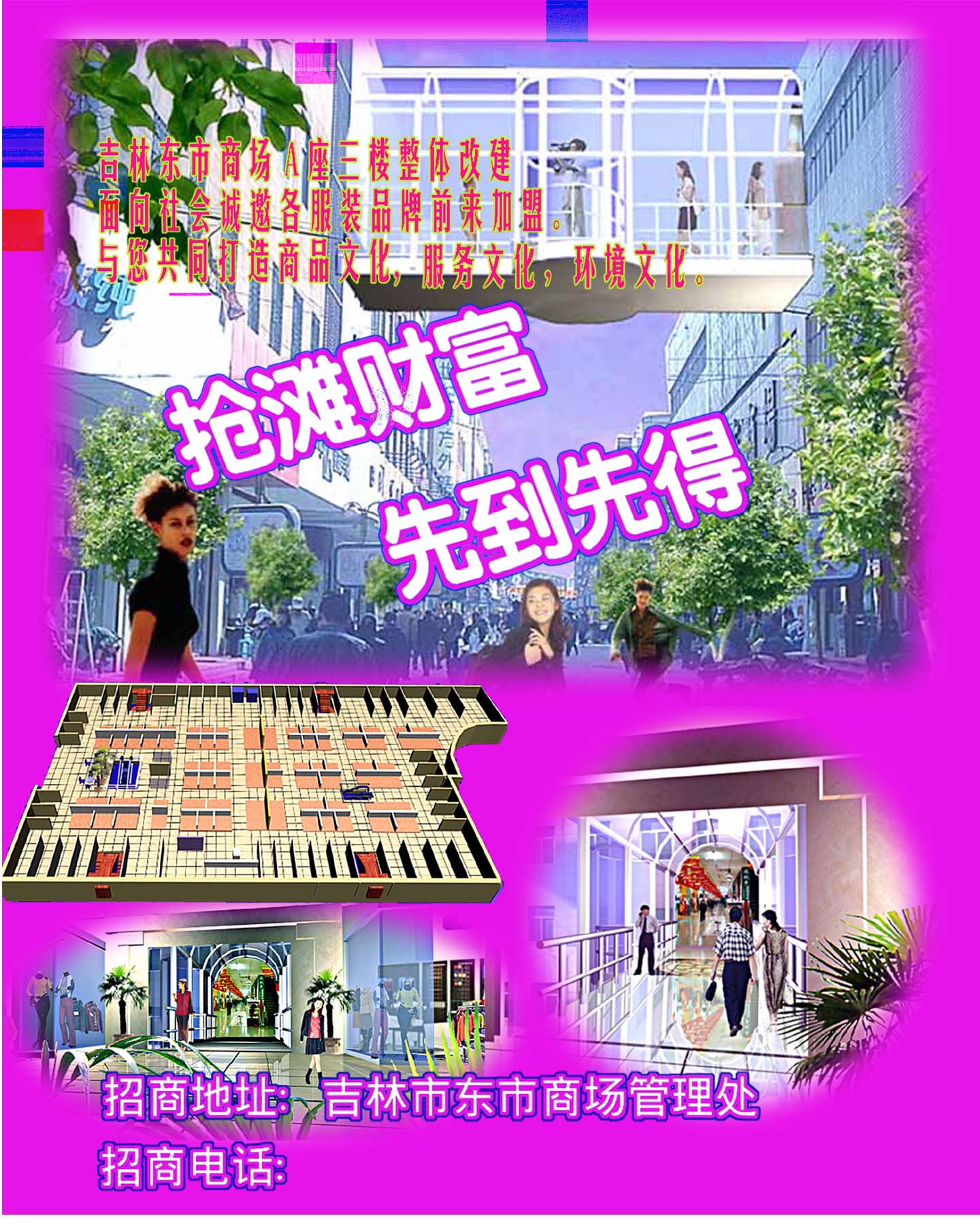 吉林东市商场A座三楼整体改建。面向社会诚邀各服装品牌前来加盟。与您共同打造商品文化、服务文化、环境文化。