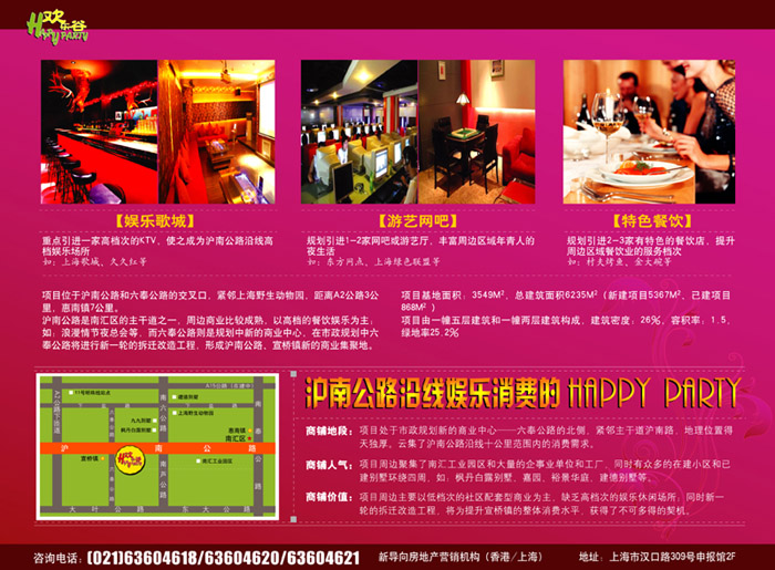新兴商圈 潜力旺铺 沪南公路沿线娱乐消费的HAPPY PARTY 娱乐歌城★游艺网吧★特色餐饮 “欢乐谷HAPPY PARTY”项目位于沪南公路和六奉公路的交叉口,紧邻上海野生动物园,距离A2公路3公里,汇南镇7公里。周边聚集了南汇工业园区和大量企事业单位、工厂、别墅,蕴藏沪南公路沿线十公里范围内丰富的消费群,为项目提供了充足的消费力。 沪南公路是南汇区的主干道之一,周边商业比较成熟,以高档的餐饮娱乐为主;如:浪漫情节夜总会等,而六奉公路则是规划中新的商业中心,在市政规划中六奉公路将进行新一轮的拆迁改造工程,形成沪南公路、宣桥镇新的商业集聚地。 “欢乐谷HAPPY PARTY”由一幢五层建筑和一幢两层建筑构成,建筑密度:26%,容积率:1.5,绿地率25.2%。项目基地面积:3549M2,总建筑面积6235M2,其中:新建项目5367M2、已建项目868M2。 “欢乐谷HAPPY PARTY”突出了娱乐歌城、游艺网吧与特色餐饮三大业态。建成后将成为沪南公路沿线娱乐消费的一大亮点。 娱乐歌城:重点引进一家高档次的KTV,使之成为沪南公路沿线高档的娱乐场所如;上海歌城、久久红等。 游艺网吧:规划引进1-2家网吧或游艺厅,丰富周边地区年青人的夜生活。如:东方网点、上海绿色联盟等。 特色餐饮:规划引进2-3家有特色的餐饮店,提升周边地区餐饮业的服务档次。如:村夫烤鱼、金大碗等。 【商铺地段得天独厚】项目处于市政规划新的商业中心——六奉公路的北边,紧邻主干道沪南路。云集了沪南公路沿线十公里范围内的消费需求。 【商铺人气潜力巨大】项目周边聚集了南汇工业园区和大量的企事业单位和工厂,同时有众多的在建小区和已建别墅环绕四周,如:枫丹白露、嘉园、裕景华庭、建德别墅等。 【商铺价值不可估量】项目周边主要以低档次的社区配套型商业为主,缺乏高档次的娱乐休闲场所;同时新一轮的拆迁改造工程,将为提升宣桥镇的整体消费水平,获得了不可多得的契机。 ——欢迎知名商业品牌与特色商业企业垂询!欢迎商铺经营人士合作。 新导向房地产营销机构(香港/上海) 上海汉口路309号申报馆2F 咨询电话:(021)63604618 63604620 63604621 13901821236