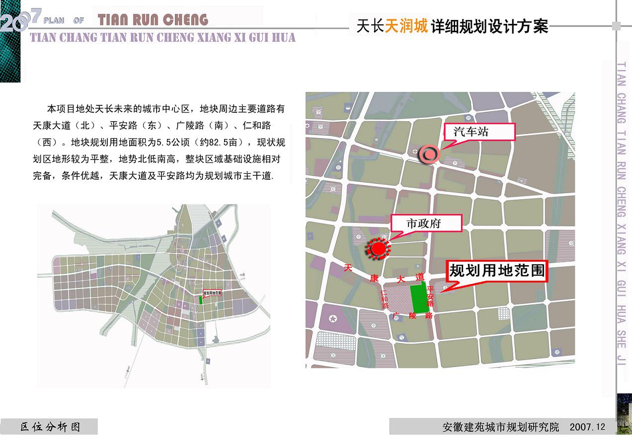 1、地理位置:该项目位于天长市未来的城市中心区,紧邻三条城市主干道即平安路、天康大道和广陵路,交通十分便利,周边4大住宅楼盘共90多万平方,地段建设已相当成熟,商业气氛即将形成。