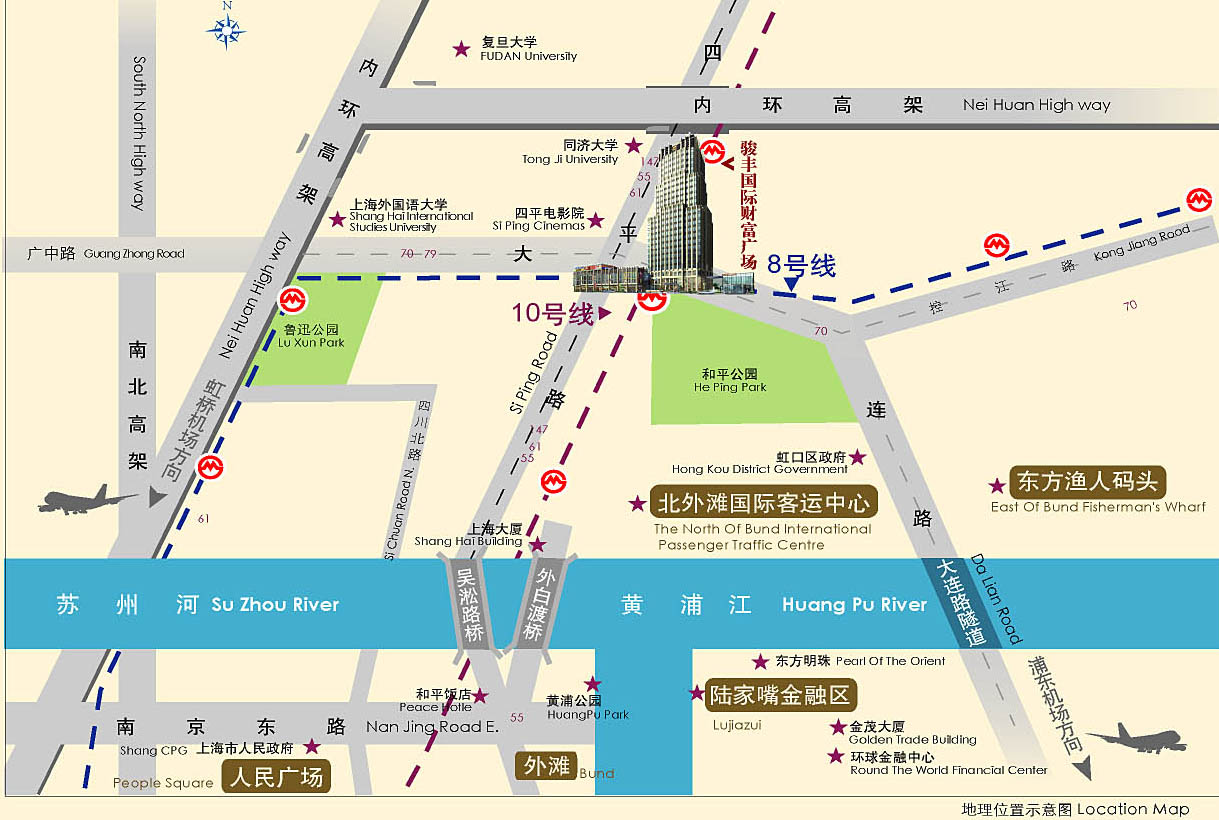 骏丰国际财富广场南面比邻和平公园,180000平方米的绿地是一个超大规模的天然氧吧,为您提供清新纯净的空气。知名学府同济大学、复旦大学、上海财经大学、上海外国语大学更是环侍项目四周,四平电影院,上海教育电视台。