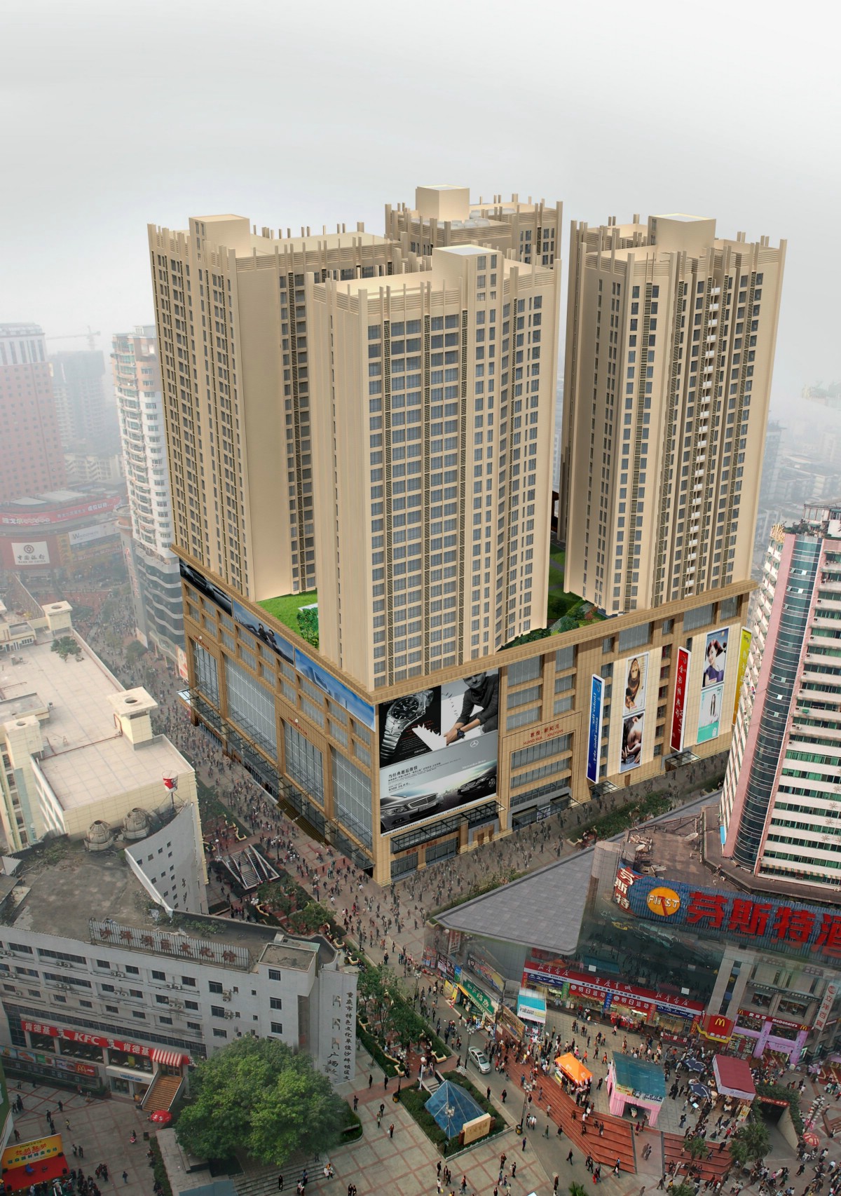 裙楼商业部分专业定位为“时尚、动感、休闲、欢乐”,将汇聚各品类精英品牌,最终成为集专业百货、餐饮、娱乐、休闲、星级电影院等为一体的一站式购物广场。各楼层全部配备中央空调,全天候的恒温购物广场,让每一位光临的客户倍感舒适。负二层四部电扶梯,负一层与一层各六部电扶梯,二至六层每层各四部电扶梯,七八层各两部电扶梯;整个购物广场配备货用电梯五部,升降电梯共十一部,单层面积约6500到8700平方米,各楼层层高及具体规划为: