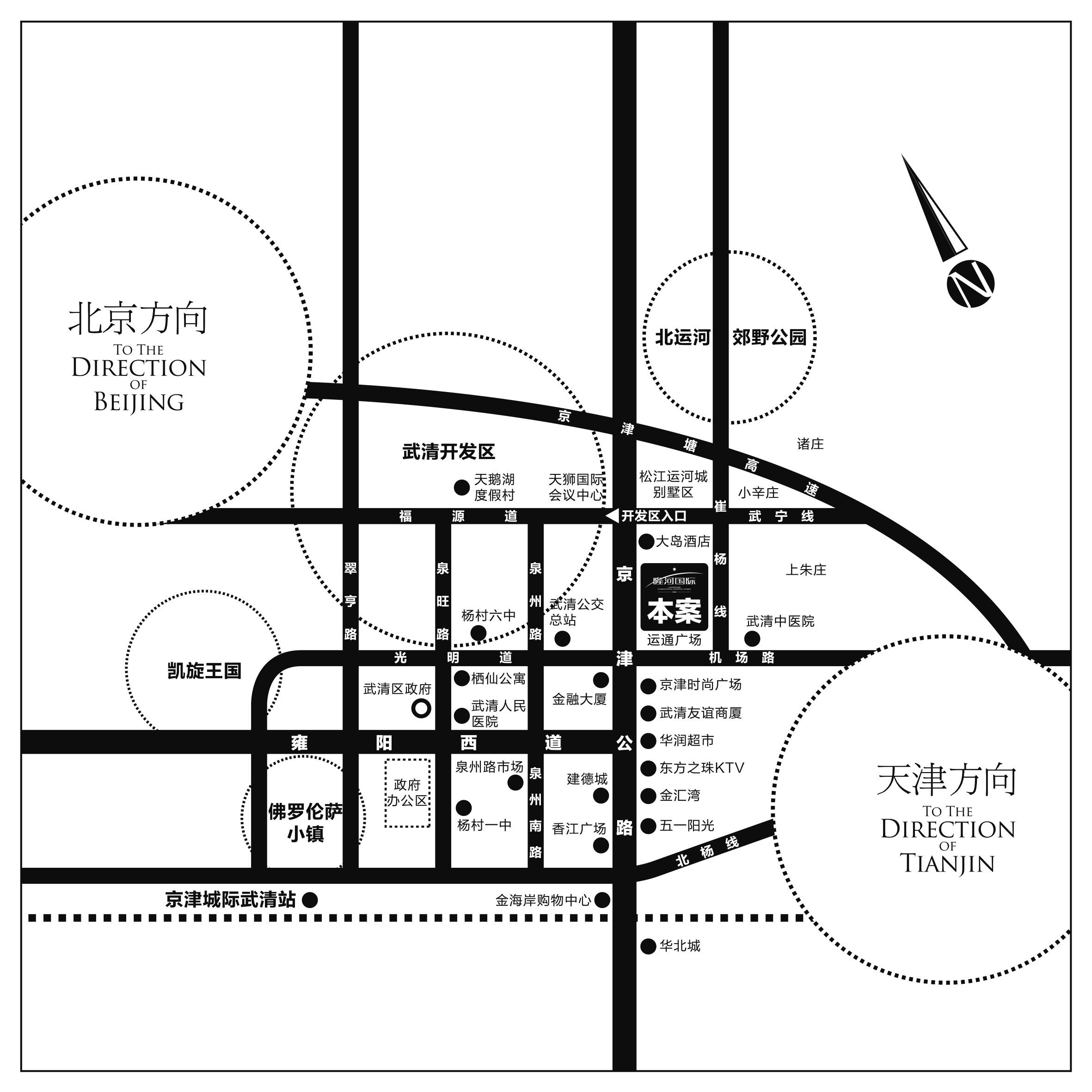 项目位于武清核心商圈,武清友谊商厦、华润超市、京津时尚广场等多种商业业态聚集,人流量大,配套设施齐全; 项目紧邻大型居住社区,项目前的运通广场是武清人流聚集的核心广场。该地段属商业与居住两相宜的成熟地段,项目升值潜力无限。与周边现有的建设项目相比,我项目在位置、人气上更具优势。